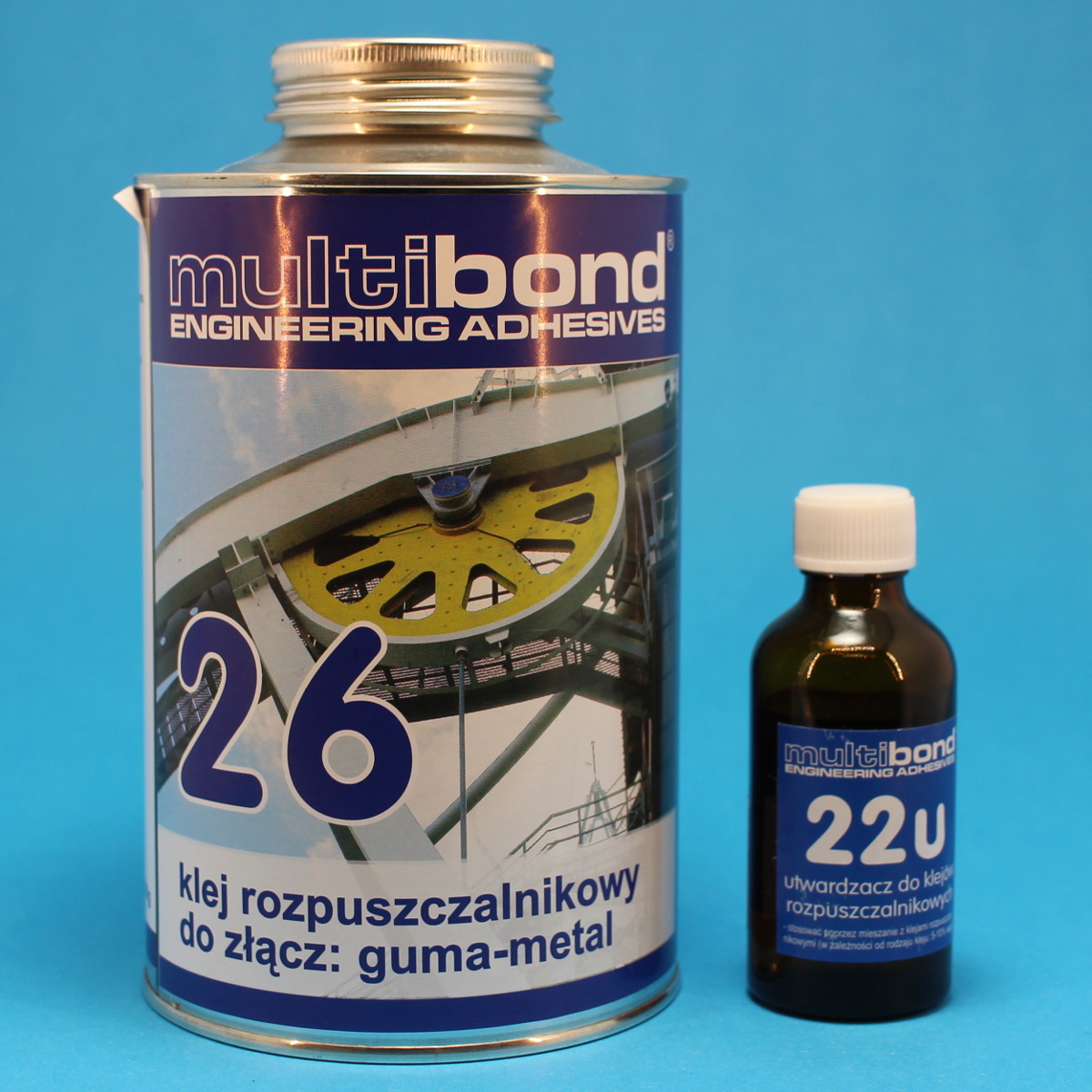 MULTIBOND-26 jest roztworem kauczuku polichloroprenowego i żywic syntetycznych w mieszaninie rozpuszczalników organicznych z dodatkiem wypełniaczy. W celu podniesienia wytrzymałości spoiny klej może być stosowany z 5% dodatkiem utwardzacza MULTIBOND-22u.